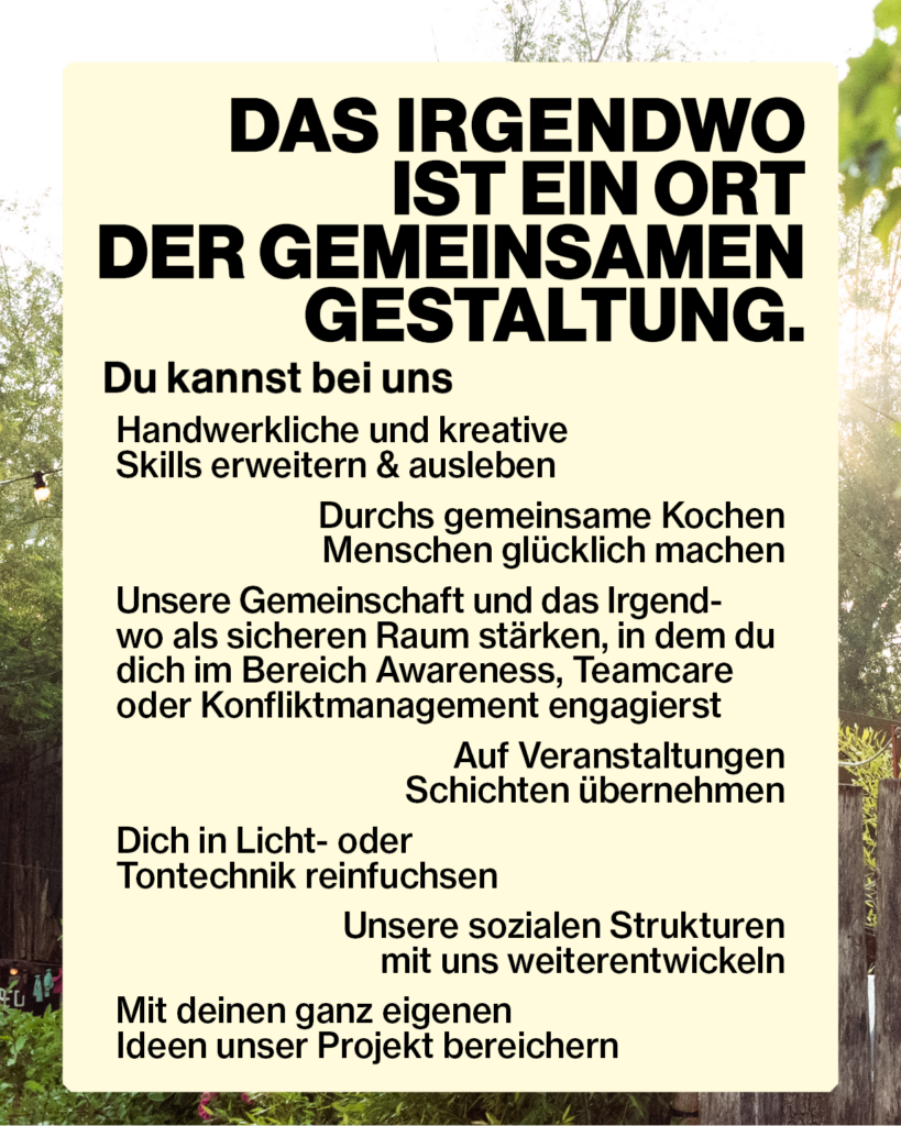 Das Irgendwo ist ein Ort der gemeinsamen Gestaltung. Du kannst bei uns